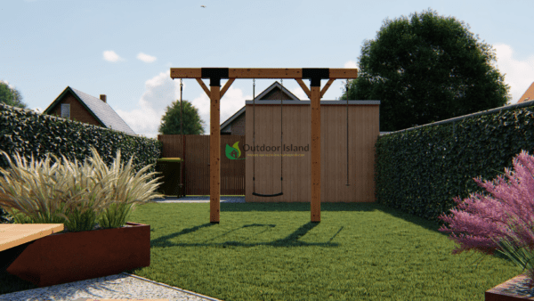 Outdoor Island liefert eine komplette Einheit. Dazu gehören das Holzpaket, alle Befestigungsmaterialien, Bohrschablone, Spiralbohrer T40, Schaukelhaken, Abdeckkappen, eine klare Montageanleitung und 1 Schaukelsitz.